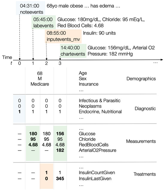 We extract the following demographic features from the table: and . Patient demographics carry essential constant information about the patient’s state, affecting the recommended treatments. For example, due to the significant difference in physiology and pharmacodynamics, helpful medications for elderly patients may differ from those for younger ones, as shown by Guidet et al. [39,40]. Sometimes, men and women receive different treatments for the same conditions, as shown by Reinikainen [41]. Insurance type, which is often a proxy for a patient’s socioeconomic status, lifestyle, and therefore health outcomes, also (unjustly) plays a role in treatments given, as shown by Spencer et al. [42].