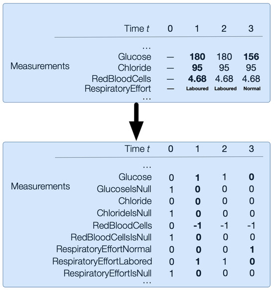 This encoding replaces each value in numerical measurement vectors from the input data with the following abnormality mapping: 1 for high abnormal values, 0 for normal values, and −1 for low abnormal values. Additionally, categorical vectors are one-hot encoded. For example, Respiratory Effort could be Normal or Labored, so it would be encoded in RespiratoryEffortNormal and RespiratoryEffortLabored length binary vectors; see Figure 5. There is no imputation of nulls. Instead, we encode nulls with an additional binary bit for every numerical and categorical measurement m. For example, is the binary variable for glucose measurements that are missing.
