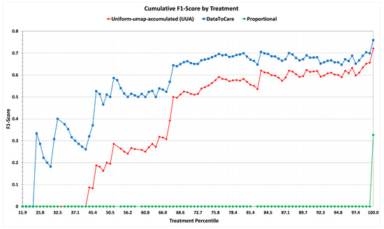 Figure 7. The treatment percentiles are based on the rarity of the treatments for all non-sequestered data. (The cumulative F1-score is computed as described in the “Accuracy with respect to treatments” paragraph of Section 4.) The graphs show the F1-score performance of DataToCare on the sequestered data with respect to treatment rarity. DataToCare using Abnormal-UMAP-Accumulated selection dominates Random and Proportional throughout.