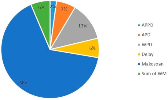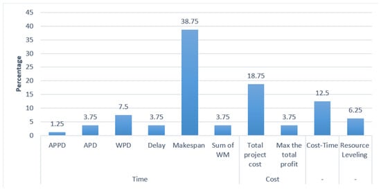 - Delays: Project delays occur when completion exceeds the due date. A project delay is formally defined as the difference between the finishing date of a project and its desired due date if, and only if, the first exceeds the latter; otherwise, the delay is zero. There are several objective functions associated with the delays. Commonly used delay-based metrics include minimizing the average project delay (APD). Other metrics, including those related to delays and the efficiency of the schedules generated, were analyzed in terms of the average percentage of project delay, efficiency, and robustness. In this review, measures related to efficiency, either average or total values, are classified as minimization of the average percent project delay (APPD) if the activity duration is deterministic; and maximization of robustness in the cases of the research presented by Zhu et al. [20], Chen et al. [21], and Wang et al. [22]. On the other hand, delays are also influenced by project weights, leading to the weighted project delay minimization (WPD) objective.