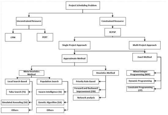 - Abdolshah, M. A Review of Resource-Constrained Project Scheduling Problems (RCPSP) Approaches and Solutions. Int. Trans. J. Eng. 2014, 5, 253–286. [Google Scholar]
