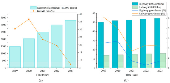 Multimodal transport, through the combination of various modes of transport, makes full use of the advantages of multiple modes of transport to complete door-to-door transport services. Sea–rail intermodal transport, an important subset of intermodal transport combining water and rail transportation, can greatly reduce the transit time of goods, simplify the transport process, and improve the efficiency of transport services [1]. In recent years, traffic and transportation networks have been getting better and better, and the mileage of highways and railroads is increasing. At the same time, the container throughput of railroads and waterways is also showing an upward trend, and the market scale of China’s smart port industry is developing rapidly [2,3,4]. The growth volume of the number of containers and public railroad mileage is shown in Figure 1.