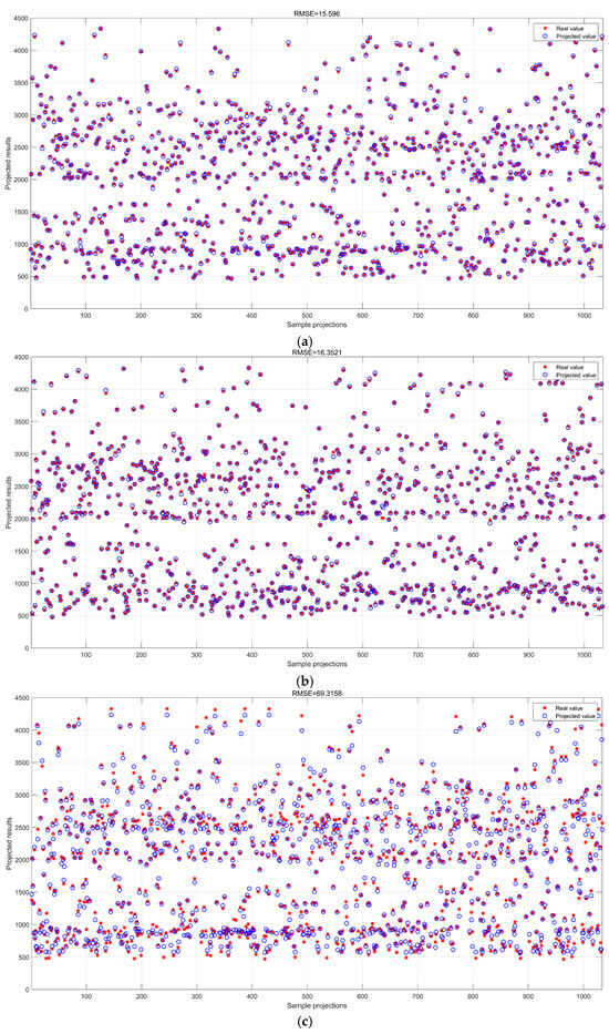 The RF and SVR, as traditional machine learning models, perform well on this regression prediction problem. The RF performs better in terms of the error stability, with an MAE and MAPE of 14.0925 and 0.85%, respectively, lower than those of the SVR, thanks to its ensemble learning mechanism’s robustness to noise and outliers. The R2 and RMSE of the SVR are 0.99913 and 28.6886, respectively, slightly better than those of the RF, indicating a strong ability to fit the overall trend of the data. However, its MAE is significantly higher, indicating that there are many large error outliers in the prediction results, which may be related to the sensitivity of the kernel function to high-dimensional features and overfitting to local extrema. The prediction results of both methods are inferior to those of the WACNN model, reflecting the limitations of traditional methods at feature automatic extraction and complex pattern capture, especially when dealing with high-dimensional or implicit spatial correlation data, where the limitations are more pronounced.