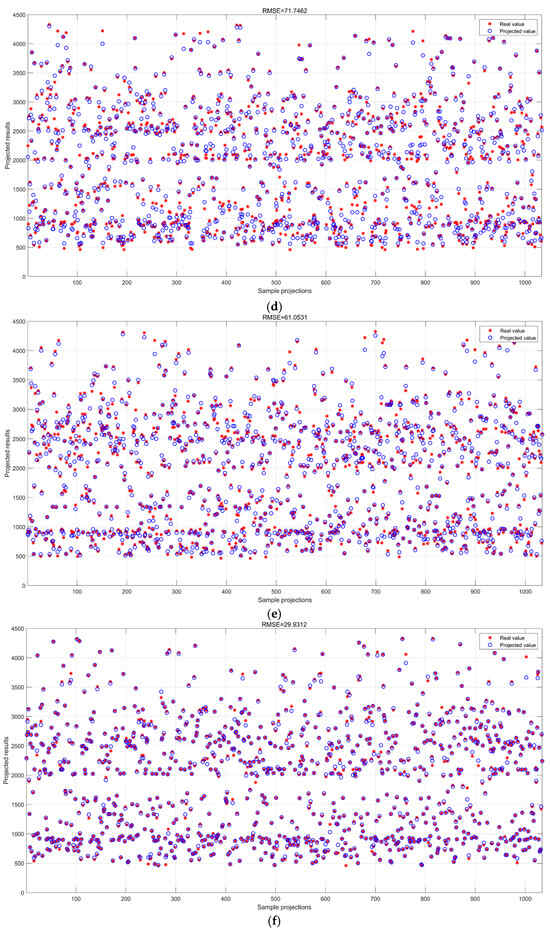 From Table 8, the CNN and WACNN performed best on the test set, with RMSEs of 15.596 and 16.3521, respectively, and the WACNN outperformed the CNN, but its training and testing errors were 17.9% and 11.05%, respectively, indicating a certain degree of overfitting. The RF’s overfitting was serious, with a difference of 53.67%, and its generalization ability was poor, whereas the SVR, although stable, with a difference of only 1.04%, had a higher prediction error with an RMSE of 28.6886. The time series models, such as the LSTM, BiLSTM, and GRU, performed worse, with a higher RMSE. The PLS performed the worst.