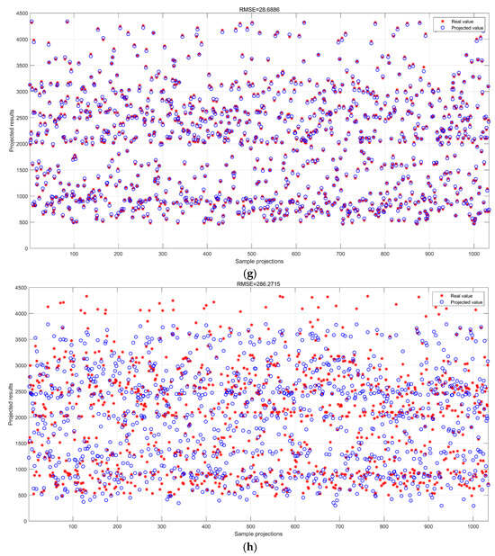 Test set results. (a) WACNN model test set prediction results; (b) CNN model test set prediction results; (c) LSTM model test set prediction results; (d) BiLSTM model test set prediction results; (e) GRU model test set prediction results; (f) RF model test set prediction results; (g) SVR model test set prediction results; and (h) PLS model test set prediction results.