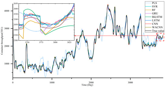 The figure shows the prediction results of the various models for container throughput compared with the real value. Among them, the WACNN model learned the overall trend of the data very well, and the overall trend of the CNN model was more fitting, but with some fluctuations. Among the three time series models, the LSTM, BiLSTM, and GRU, the BiLSTM model had less fluctuations in relation to the data, and the LSTM and GRU models had more ups and downs and the trend was not very fitting. The two ML results were better than the time series models and their overall trends were smoother. It can be seen that the worst was the PLS, the traditional statistical model. Although the model was consistent with the true values in terms of the overall trend, its predicted results differed significantly from the true values.