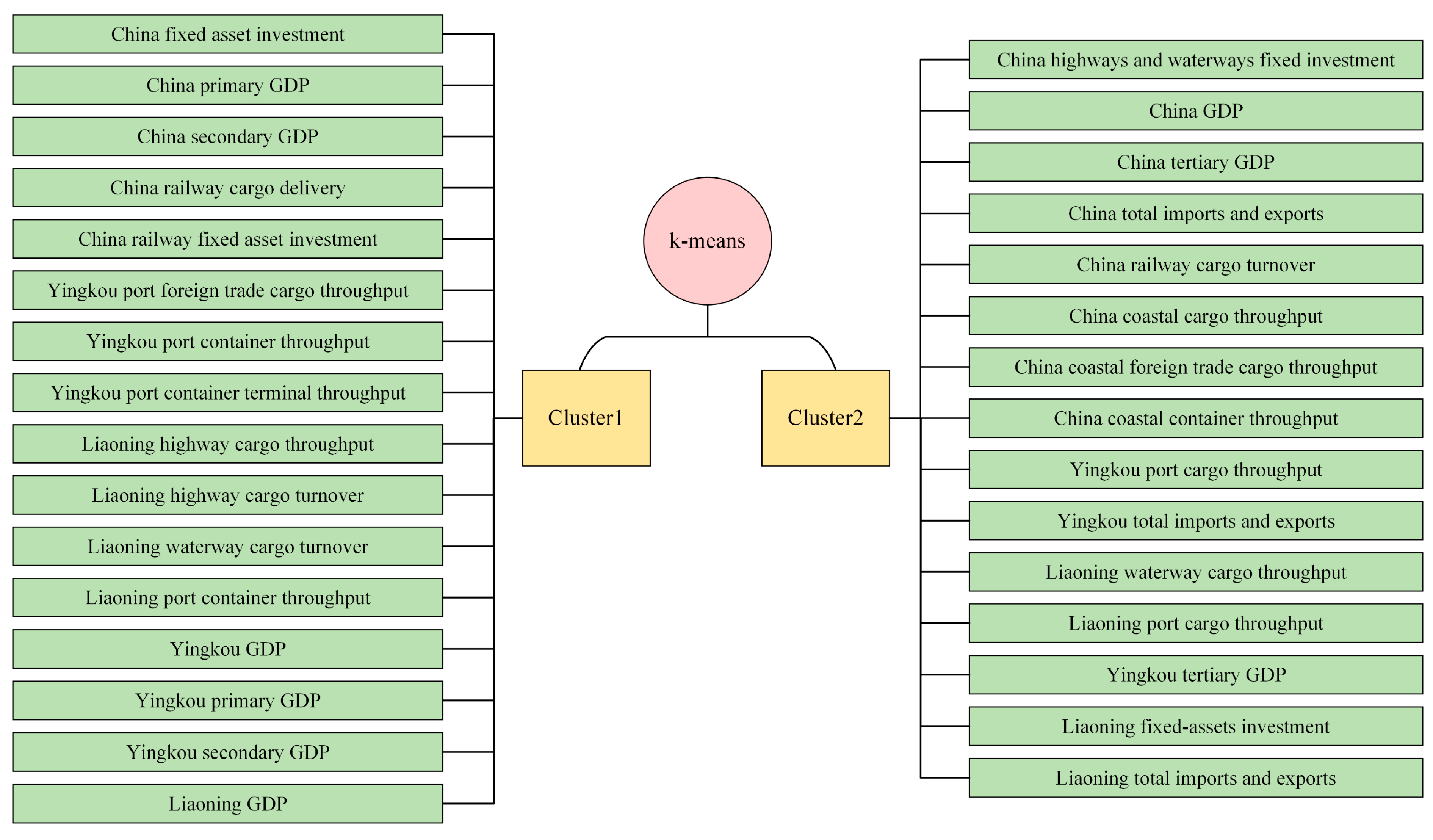 The research on the selection of the indicators for container throughput forecasting has experienced an evolution from a single economic driver to the integration of multiple dimensions [21]. Early studies generally focused on the correlation between macroeconomic indicators and socially productive activities, such as the GDP; the volume of import and export trade; investment in fixed assets; and the output value of secondary industries as the key influencing factors [22]. However, these studies were mostly limited to economic variables, ignoring the impact of other port factors on the throughput. In recent years, scholars have begun to try to construct more complex indicator systems to solve this problem, such as using dimensionality reduction techniques, such as principal component analysis (PCA) and dynamic factor analysis (DFA), to screen the economic indicators with high information density [23,24]. This can significantly reduce the data redundancy while ensuring prediction accuracy. Other researchers have gradually incorporated port-specific operational indicators into the model by studying the port-influencing factors [25], providing a new perspective for explaining throughput differences among ports in the context of regional economic homogenization. Although researchers have started using various indicators for regression prediction, there is no standardized system for the selection of indicators. Therefore, it is not comprehensive enough. In summary, we should summarize the classification criteria in order to select the indicators more reasonably.