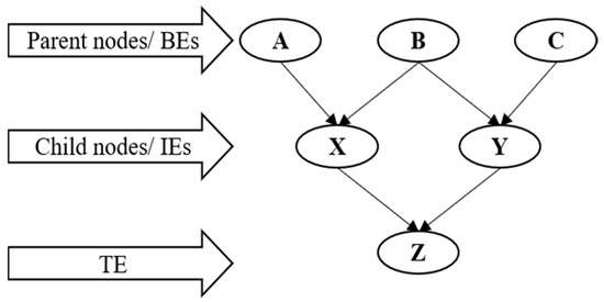 BNs are mathematical models representing the causal relationship for different risk variables using CPTs. In a BN, nodes are connected through directed acyclic graphs (DAGs), and edges represent causal relationships between risk variables [30]. A variable’s probability can be updated based on the new evidence that the parent’s node acquired. The BN approach is a powerful tool for modeling complex systems, decision-making, and machine-learning applications where updating probabilities in response to updated information is crucial to the model’s accuracy [31]. A simple description of the BN is shown in Figure 1. Nodes A, B, and C are parent nodes or BEs, Nodes X and Y are child nodes, also known as intermediate events (IEs), and Node Z is the top event (TE) or the outcome of this network.