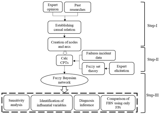 Following the calculation of CPr and FPr in Step II, this step explains the construction of the FBN using CPTs as input to the model. The primary purpose of this step is to estimate the likelihood of TEs, checking the chances of failure using prior probabilities. Using the prior probabilities, different scenarios can be created to check the influence of different BEs on the entire network. Diagnosis inference is performed to determine the most critical parent nodes by taking the TE with a confirmed 100% failure case. The last part of this step compares the FBN constructed through CPr plus FPr and the model constructed exclusively using FPr.