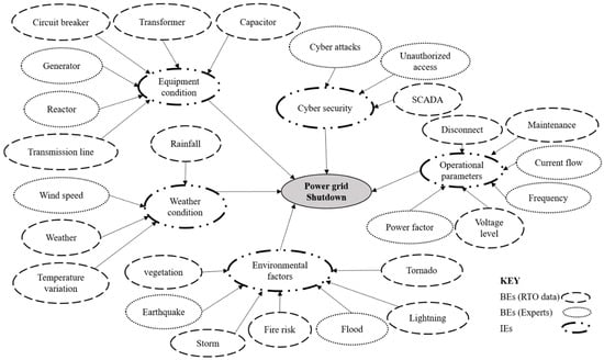 In this step, the most influential BEs are identified, leading to the likelihood of TE. The identification of BEs is performed in two phases. During the first phase, two experts were consulted, one with more than 30 years of experience in academia with extensive research on power grids and a second expert with more than ten years of experience working in the power grid industry. Second, based on past research through a comprehensive literature review [2,22,40,41,42,43,44,45,46,47,48], twenty-six BEs were identified as the root cause of the most critical risk factors, as shown in Figure 3. The focus of this research study, with “power grid shutdown” as TE, is intended to capture the overall system failure, aggregating the contributing factors into a single analysis for clarity. However, examining how shutdowns at specific generating stations and their associated load curtailments influence the grid’s resilience is pertinent. In interconnected networks, the failure of a particular generating station can cascade across the power grid. For instance, the inability of a high-capacity station in a critical location could disproportionately impact the grid compared to a smaller, less strategically located station. When a generating station shuts down, the load it previously supplied is redistributed to other operational stations or transmission lines. This redistribution may exceed the operational limits of certain lines or transformers, creating system-wide imbalances, triggering additional outages, propagating through the network, and escalating the risk of a complete grid shutdown. Similarly, load curtailments also serve as a critical operational measure to mitigate the impact of generating station outages. By reducing demand on the grid during a station’s failure, operators can maintain system balance and prevent cascading failures. This study uses historical incident failure data from an RTO to calculate CPr. The provided RTO data contain only sixteen BEs; the remaining ten BEs were identified by consulting experts and a literature review.