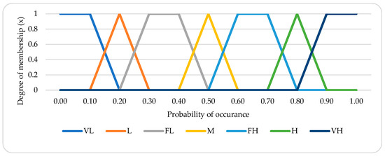 For this study, a seven-point fuzzy membership function is used, with very low (VL), low (L), fairly low (FL), medium (M), fairly high (FH), high (H), and very high (VH) remaining the highest scores used to quantify the BEs. The descriptions of the scores, along with a description of the linguistic variables, are shown in Figure 5.