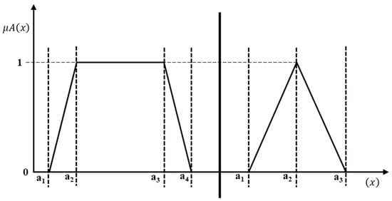 In our model, converting FPs to FPr is essential for assessing risks such as equipment failure, human error, and environmental factors. We utilize trapezoidal and triangular membership functions to represent fuzzy sets, as these functions effectively capture the imprecision inherent in expert judgments and uncertain data [27]. The trapezoidal function is beneficial for risk factors with well-defined thresholds, while the triangular function is more suited for risks that exhibit gradual transitions. Trapezoidal and triangular membership functions can be calculated using Equation (6).