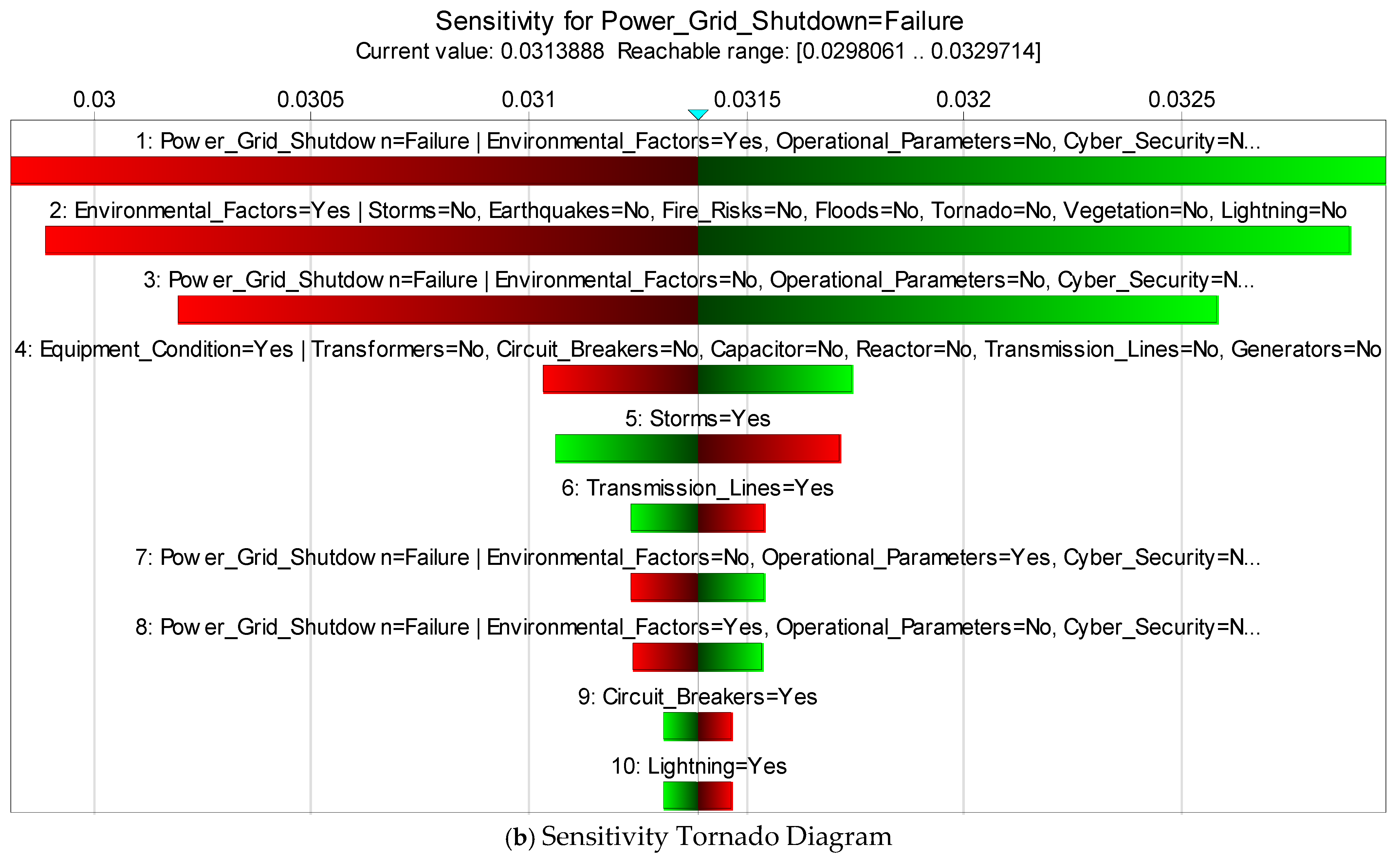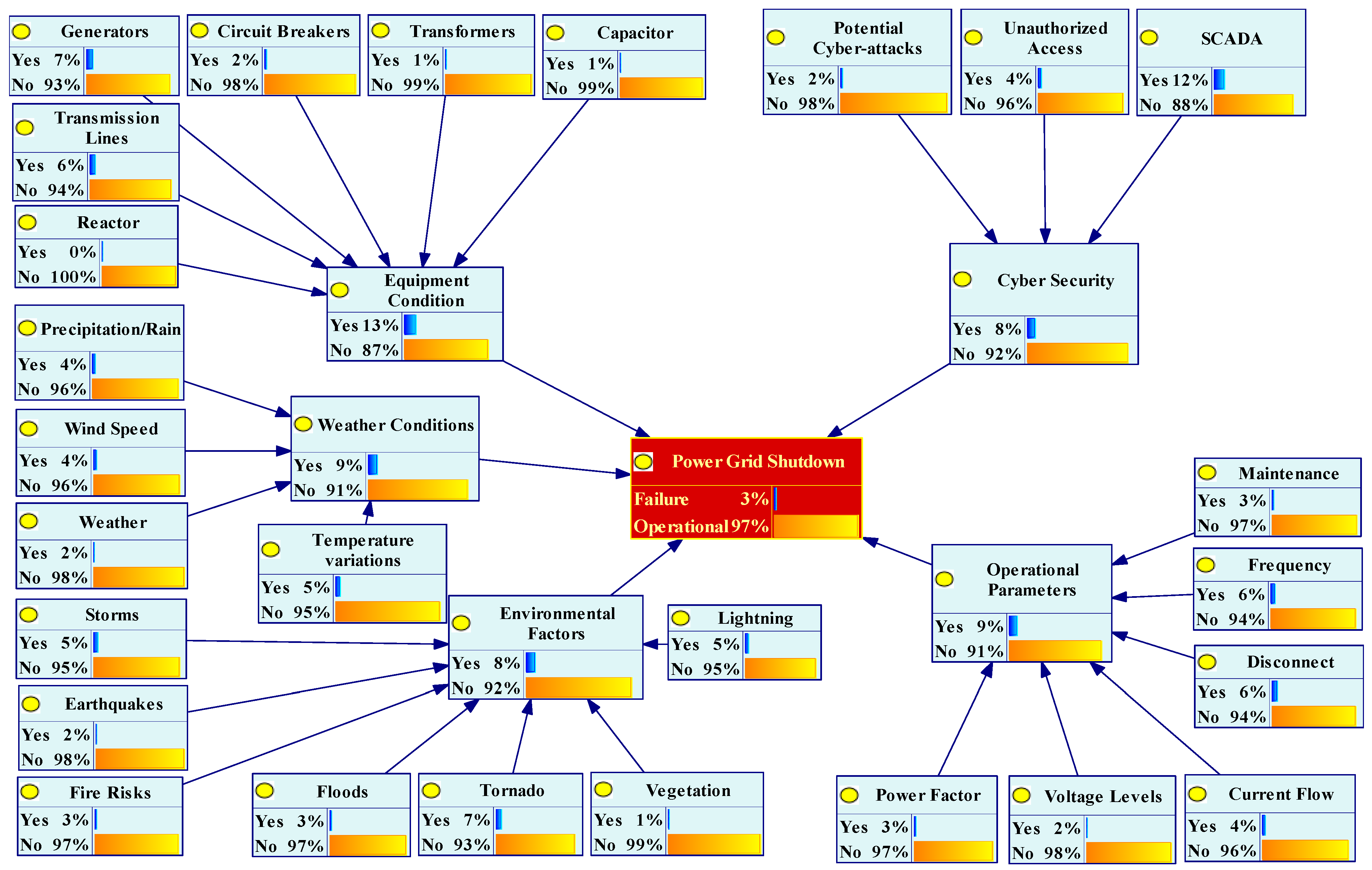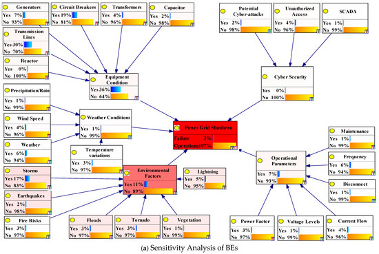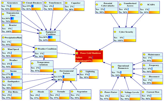 - Diagnosis inference with 100% confirmation of TE highlights the most critical IEs as environmental factors and equipment conditions, with 59% and 22% failure probabilities, respectively. Environmental factors remain the most significant IE, with the root cause of fire risk as the most influential BE, with a failure rate of 35%, followed by storms (13%). Equipment conditions are also a critical IE with root causes of transmission lines (24%), generators (20%), and circuit breakers (19%). Diagnosis inference confirmed the authenticity of the FBN for cybersecurity and operational parameters, with leading root causes for the likelihood of TEs being unauthorized access (10%) and frequency changes (9%).