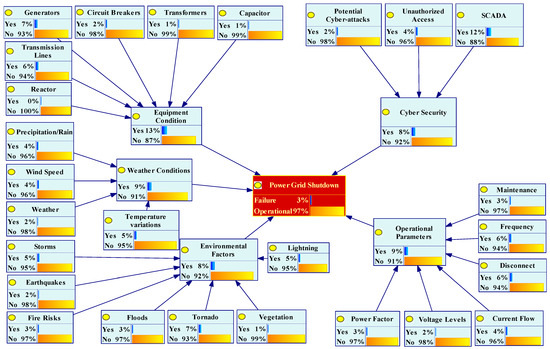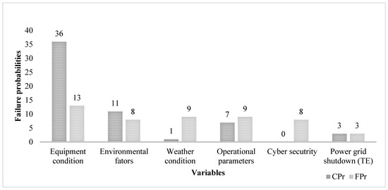 - The initial risk assessment with sixteen BEs using CPr and ten BEs using FPr shows that the probability of TE (power grid shutdown) is 3%. Environmental factors account for 11% of TE failure rates, followed by equipment conditions, which account for 36%. A higher failure probability from equipment conditions confirmed that the root causes are the tripping of transmission lines and circuit breakers. A failure probability of 11% from environmental factors endorsed the increased risk of the likelihood of TEs because of storms and weather conditions.