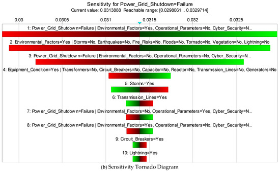In FBNs, diagnosis inference is a valuable technique for determining posterior probabilities based on new, updated information. When new evidence is available, it can be applied to the model to trigger the IEs and root causes to determine the effect on the entire network. It begins by assessing the impact of the evidence provided for the power grid failure node on its parent nodes. It is possible to propagate the impact of such evidence backward and forward to determine which parent nodes affect the likelihood of TE. In this study, the evidence has been propagated—a confirmed power grid shutdown (assuming a failure probability of 100%)—illustrating the FBN model with the failure evidence inserted. There was a significant increase in the probable occurrence of environmental factors from a baseline probability of 11% to 59%, and the significant BE fire risk increased from 3% to 35%. Similarly, the posterior probabilities of equipment conditions decreased from 36% to 22% with BE circuit breakers, generators, and transmission lines, with new probabilities of 19%, 20%, and 24%, respectively. The results from the diagnosis inference are shown in Figure 11, with a TE failure probability of 100%.