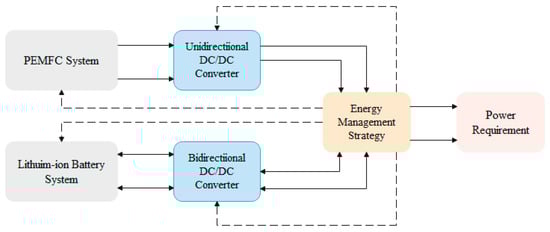 The dashed lines in Figure 1 represent the control signal transmission path, while the solid lines represent the direction of electrical energy transmission. In the proposed configuration, the PEMFC and lithium-ion battery jointly supply the vehicle’s required power. The PEMFC is connected in parallel to the DC bus through a unidirectional DC/DC converter, providing continuous power to the vehicle. The lithium-ion battery is connected to the DC bus via a bidirectional DC/DC converter, supplying supplementary power for the stack startup. The advantage of this configuration lies in the ability of the lithium-ion battery to assist the fuel cell system in providing supplementary power, thereby improving power output performance. Moreover, the lithium-ion battery can provide or absorb transient power demands or responses, extending the service life of the stack.