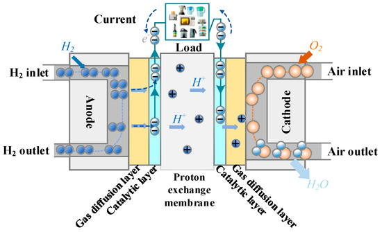 The PEMFC system is a complex, multi-input, multi-output, and multi-time-scale nonlinear system [19]. It involves various dynamic processes, such as gas flow, electrochemical reactions, gas-liquid phase transitions of water vapor, and heat exchange between channels [20]. Generally, the regulation capability of the fuel cell stack itself is limited, particularly when there are significant changes in external environmental conditions. Therefore, the design and construction of corresponding auxiliary subsystems are fundamental to ensuring the stable operation of the PEMFC stack. As shown in Figure 2, hydrogen and oxygen flow through the anode and cathode, respectively, entering the PEMFC through the flow channels. After passing through the gas diffusion layer, they enter the catalyst layer where they gain and lose electrons. The electrons generated by the electrochemical reaction flow through the external circuit, forming an electric current. Simultaneously, the heat produced is absorbed by the exhaust gases and the fuel cell itself [21].