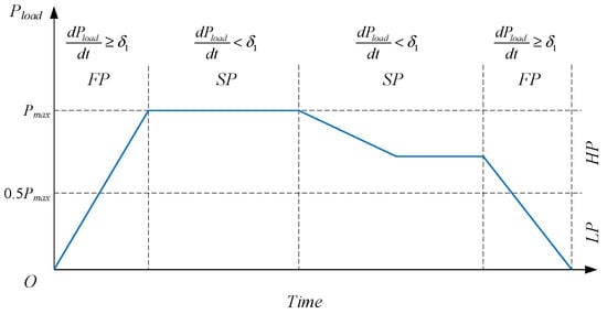 In the traditional EMS, adhering to the stack temperature, maintaining SOC, and minimizing fuel consumption are considered to achieve the optimal performance of the hybrid power system. As a rule-based approach, a state machine (SM) is employed to classify the vehicle’s operation into high–low power (HP and LP) and fast–slow response scenarios (FP and SP). In Figure 3, the FSM method is applied for power distribution during fast load variation phases, while MPC is used for slow load power variation phases. When the slope of change in the load demand power exceeds a predefined threshold, the vehicle is determined to be in the FP phase. Similarly, when the vehicle’s power is less than half of the maximum power, it is determined to be in the LP phase.