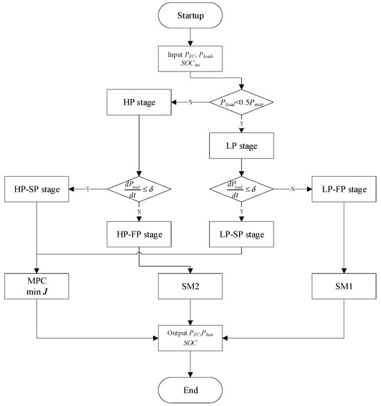 This section proposes an energy management method that combines SM and MPC, as shown in Figure 5. Firstly, the power demand stage of the vehicle—whether it is in the high-demand stage or the low-demand stage—is determined based on the required power and the initial SOC state of the lithium-ion battery. Then, we determine the response conditions based on the electricity demand. The SM method is used when the power gradient changes significantly, while the MPC method is used when the power change is slower. For times with high power demand, use the SM1 method; otherwise, use the SM2 method.
