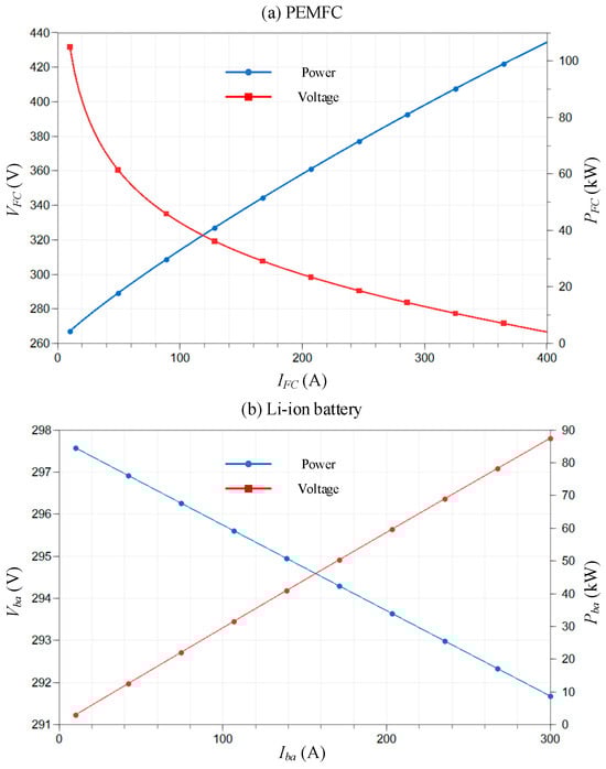 The voltage and power outputs of both types of batteries are shown in Figure 6. Specifically, to protect the proton exchange membrane of the fuel cell, the maximum loading current is set to 400 A. The output voltages and power of both systems also meet the expected conditions.