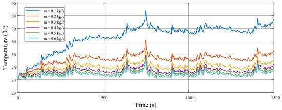 In the HWFET test, the temperature variation curves of the battery stack under different cooling water flow rates, based on the battery stack power obtained using the SM-MPC method, are depicted in Figure 11. Obviously, as the cooling water flow rate increases, the overall temperature curve of the battery stack shifts downward. To ensure that the battery stack operates within an appropriate range, the cooling water flow rate is limited to below 0.5 kg/s here, in order to reduce water pump power consumption while maintaining the battery stack temperature.