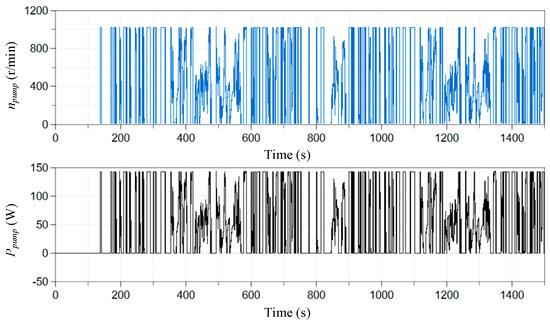 The power and speed of the circulating water pump are shown in Figure 13. It can be observed that the pump’s speed fluctuates rather rapidly for most of the time. The speed easily reaches the preset upper limit and may drop abruptly to zero. Consequently, although the fuel cell stack temperature remains stable in this experiment, the temperature range being maintained is excessively large. This leads to frequent start-stop operations of the water pump, indicating that further improvements in the performance of the control algorithm are still required. In addition, the power consumption of the water pump is negligible compared to the overall power generation of the hybrid system. Therefore, when modeling high-power fuel cell hybrid systems, more auxiliary components can be considered to refine the system modeling process.