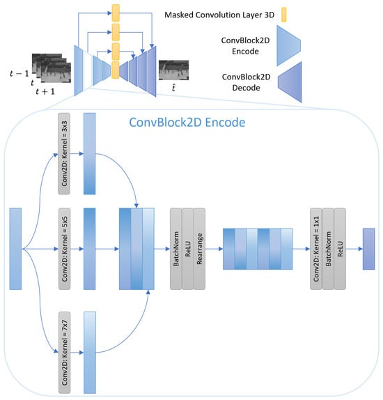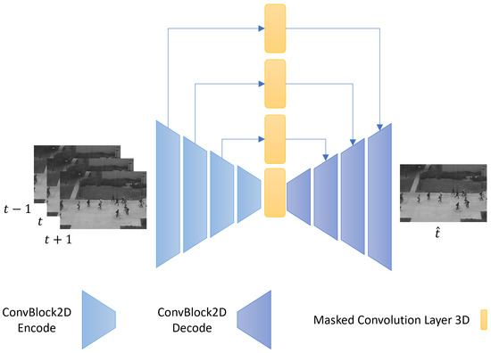 In contrast to “Self-Supervised Predictive Convolutional Attentive Block for Anomaly Detection” [14], our proposed MaskedSkipUNet architecture uses MaskedConv3D layers not just as feature extractors, but as a mechanism to infer reconstruction based on surrounding spatio-temporal hierarchical features.