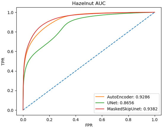 Figure 6 shows the Receiver Operating Characteristic (ROC) curves for the AutoEncoder, UNet, and MaskedSkipUNet, accompanying their specific AUC scores. With the UNet registering an 86.6% AUC, the MaskedSkipUNet, boasting a 93.8% AUC, only marginally surpasses the AutoEncoder’s score of 92.9%.
