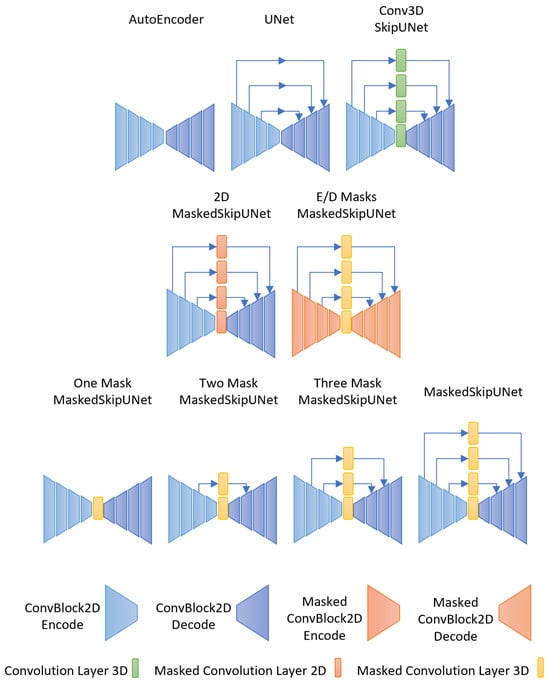 Visual representations of the architectures evaluated in our ablation studies (Section 6). From the baseline AutoEncoder to our primary contribution, the MaskedSkipUNet, each variant elucidates the impact of incorporating or excluding specific components like skip connections, MaskedConv3D layers, and their interplay.