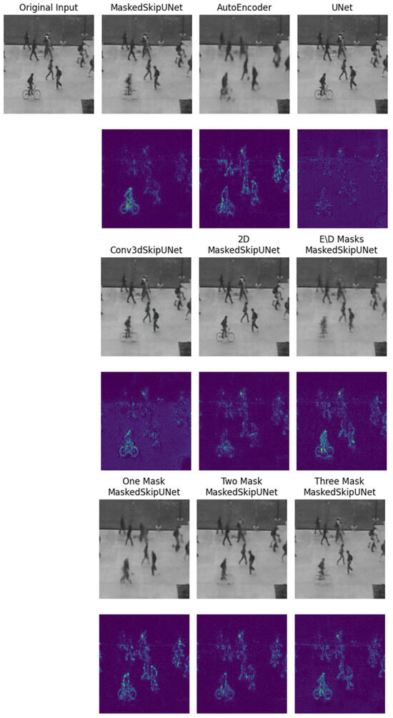 Reconstruction outputs from ablation models on a Ped2 frame with an anomalous bicycle and normal pedestrians. Underneath the title of each model is the reconstructed frame (top) and its pixel-wise difference from the original (bottom), illustrating the impact of each architectural variant on anomaly suppression.
