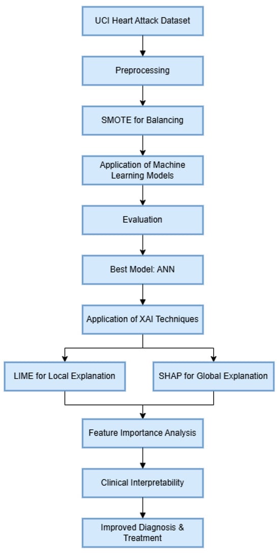 To enhance the interpretability of the ANN model, XAI techniques like LIME and SHAP were applied. LIME explains individual predictions locally, while SHAP provides global insights into feature influence. Both techniques helped identify significant features in the heart attack prediction, enhancing clinical interpretability. This improved transparency aids in more accurate diagnoses and treatment planning, making AI-driven decisions more actionable for healthcare professionals. Figure 1 depicts the flow of the study.