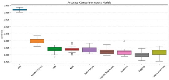 An imbalance dataset was used in the experimentation where SMOTE was applied to create a balance of classes within the dataset. Furthermore, various ML models were applied with the intention of finding the model that can best classify the given dataset. After experimentation, it was observed that SMOTE-based ANN has outperformed all other models with an accuracy of 96%. It is worth mentioning that in order to prevent data leakage and ensure valid performance estimation, SMOTE was applied only within the training folds during cross-validation rather than on the entire dataset before splitting. This prevents synthetic samples from appearing simultaneously in both training and test sets. Additionally, we included an external 20% holdout validation set to assess model generalization beyond cross-validation. In order to comprehensively assess the performance of ML algorithms, additional metrics such as precision, recall, and F1-score were utilized alongside accuracy. Table 3 depicts the evaluation results obtained after applying various ML algorithms on a balanced dataset before and after applying SMOTE. The results obtained for both classes show how SMOTE has effectively assisted in enhancing the evaluation results for the minor class, ultimately enhancing values for evaluation parameters. Moreover, to further analyze the impact of information leakage and the performance of ANN, we conducted a comprehensive comparative analysis of nine classifiers: ANN, Random Forest, SVM, KNN, Naive Bayes, Logistic Regression, AdaBoost, Bagging, and a Voting Ensemble using pairwise t-test. Using 30 repeated runs for each model, we calculated the average accuracy and applied paired t-tests comparing ANN’s performance against each alternative. ANN achieved a mean accuracy of 96.1%, outperforming all other models, with the next-best Random Forest averaging 85%. Paired t-tests revealed statistically significant differences in performance (all p-values < 0.0001), confirming that ANN’s superiority was not due to random variation but represents a robust, statistically validated improvement. The 95% confidence intervals for ANN’s accuracy (95.2–97.0%) showed no overlap with the confidence ranges of competing models, reinforcing its leading position. Figure 3 presents boxplots illustrating the accuracy distributions across all models, clearly demonstrating ANN’s dominance in both central tendency and spread. These results establish ANN as the most effective and reliable classifier for heart disease prediction within our study framework.