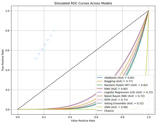 Furthermore, to ensure the reliability of results external holdout of 20% was also set for testing purposes. The holdout method, which involves consistently reserving a segment of the dataset for testing while utilizing the remainder for training, guarantees that model assessment accurately represents generalizability instead of overfitting to particular data divisions, hence enhancing the reliability of the provided metrics. Table 4 displays the average performance metrics—precision, recall, F1-measure, accuracy, and ROC-AUC—of various machine learning algorithms applied to the UCI Heart Disease dataset utilizing a cross-validation holdout of 20. The Artificial Neural Network (ANN) exhibits exceptional performance, achieving 95% accuracy, 95.3% precision, 94.9% recall, 94.8% F1-measure, and 98% ROC-AUC a, significantly surpassing traditional machine learning algorithms. Random Forest emerges as the most effective classical model, with 84% accuracy along with robust precision. Ensemble approaches, including Bagging, AdaBoost, and Voting Ensemble, attain moderate accuracies of approximately 80–81%, although individual models such as SVM, KNN, Logistic Regression, and Naive Bayes fall within the 80–82% accuracy range. Using the above results of the holdout, we further analyze the performance of ANN using ROC curve analysis, as shown in Figure 4. It evaluates the classification efficacy of several machine learning models, with each line illustrating the balance between true positive and false positive rates across different thresholds. The Artificial Neural Network (ANN) exhibits the greatest AUC of 0.98, signifying near-perfect class discrimination and markedly higher performance compared to the other models. The elevated AUC indicates that the ANN continuously attains an optimal balance between sensitivity and specificity, hence reducing both false positives and false negatives. Conversely, models such as Logistic Regression, Naive Bayes, and the Voting Ensemble exhibit lower AUCs of 0.72, indicating diminished overall classification efficacy. The diagonal dashed line (AUC = 0.5) signifies random chance, and the greater the distance of a model’s curve below this line, the superior its predictive capability—with ANN markedly surpassing all other models in this aspect. Further, to ensure the complete efficiency of obtained results, 10-fold cross-validation is also applied, as shown in Table 5. It can be observed from the above results that the ANN model demonstrated superior performance compared to traditional classifiers, as has also been shown in other disease prediction studies [72,73]. Despite ensemble methods typically performing well, ANN achieved the best balance between sensitivity and specificity after SMOTE was applied, highlighting its capacity to capture nonlinear relationships in the limited dataset. Moreover, Table 6 summarizes the training and testing times of all employed models. Bagging and RF demonstrated the fastest execution with only 2 s for training and 0.3 s for testing; however, the performance was notably low. In contrast, AdaBoost showed high computation time (61 s training, 6.1 s testing) but with comparatively lower performance. In contrast, ANN requires more time, like AdaBoost, i.e., 69 s for training and 5 s for testing, but the performance of ANN justifies its higher computational cost.