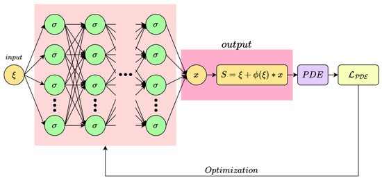 A schematic of the implemented architecture is shown in Figure 2, illustrating the computational flow from input ξ , through the modified output block with the mask ϕ ξ , to the evaluation of the loss based on the diffusion equation.