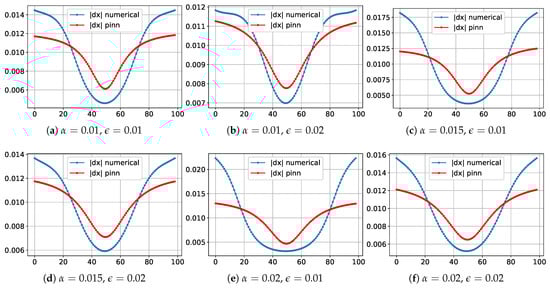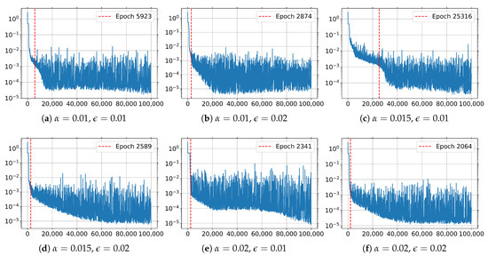 In all tests, the loss function decreases to 0.001; however, the convergence rate varies. Increasing α and decreasing ϵ require more iterations to reach the specified error threshold, which may be due to the model’s more complex adaptation to sharp changes in the control function. In tests with α = 0.01 and ϵ = 0.02 , the error threshold is reached more quickly, whereas for α = 0.015 and ϵ = 0.01 , significantly more epochs are required for convergence. The results indicate that smoothing the control function positively affects the convergence speed of the PINN method, while increasing the intensity of grid clustering leads to longer training times.