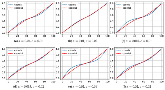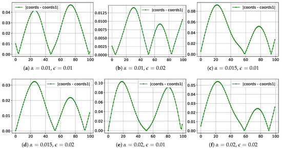 It can be seen that the largest discrepancies occur near the region of node clustering. For small values of α , the difference between the methods remains insignificant. However, as α increases, the numerical method exhibits a sharper change in grid density, leading to greater coordinate deviations. Parameter ϵ also affects the nature of the differences between the methods: as ϵ increases, the discrepancies decrease since both methods exhibit less pronounced grid clustering. The maximum deviation, depending on the parameters of the control function, ranges from 0.01 to 0.1, and most tests show a difference within 0.03–0.05.