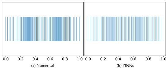 Below is a detailed analysis of the obtained results, including a comparison of both methods based on key indicators such as the degree of grid clustering, uniformity of the node distribution, deviations between the numerical method and PINNs, and specific features of neural network model convergence. Figure 8 shows the node distribution in the numerical method and the PINN method for control points x 1 = 0.3 and x 2 = 0.7 .
