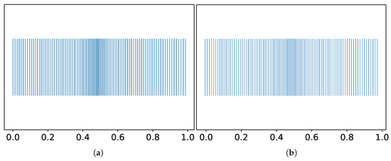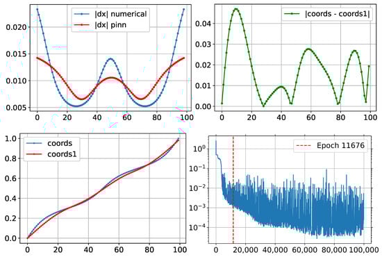 Visually, the overall structure of the mesh in both cases is similar, with the node density adapted in the central region of the domain according to the control function. However, the exact boundary values reveal a key difference between the methods. When using the mask, the coordinates at the interval boundaries match the target values precisely: s 0 = 0.00000000 , s 0 = 1.00000000 . In contrast, when boundary conditions are enforced via the loss function, noticeable deviations are observed: s 0 = 0.00554807 , s 1 = 0.97303724 .