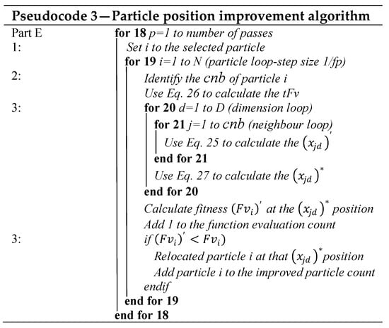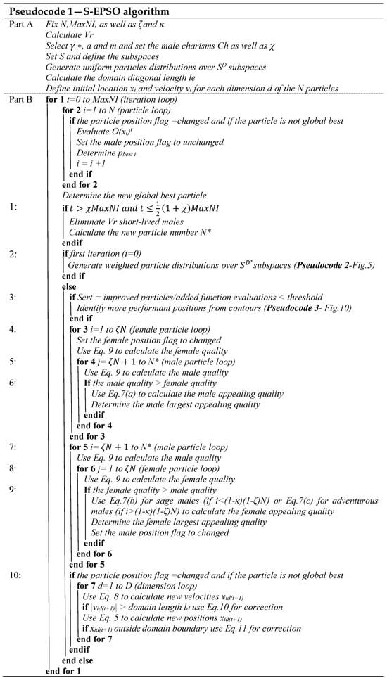 The present section corresponds to point 1 of the introduction. To enhance the descriptions, it begins with Figure 1, which describes the pseudocode of the S-EPSO algorithm. In order to facilitate the duplication of the model or parts of it, the pseudocode is voluntarily extensive. The presentation divides the algorithm into two parts. Part A groups the Initiation steps, while Part B describes the Computation steps. Numbers also mark the beginning positions of operation groups.