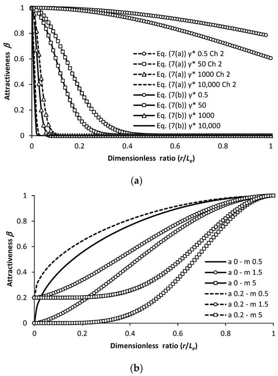 In Equation (7), r is the Euclidian distance and is the medium haziness coefficient equivalent to the light absorption coefficient in Firefly. Moreover, as indicated in [], since is a dimensionless variable, to respect the principle of dimensional homogeneity, r, which is the particle separation distance should also adopt a dimensionless form. This variable must be adapted to the probed landscape. The diagonal of the D-dimensional domain (Le) is probably the best variable to use to define the dimensionless distance (Figure 1, Part A). Parameter Ch in Equation (7a) denotes the charisma of a male type. A value greater than one augments the visibility of a particle in hazy environments. Equation (7c) shows that the visibility of the female particles to the adventurous male type is not affected by the landscape haze. Equation (7c) produces values which increase with the dimensionless distance . Factors a and m are two constant parameters. Parameter introduces an offset of the function. For example, results in 0 attractiveness for close female particles (), whereas generates an attractiveness of 1 for all female particles regardless of r. On the other hand, m controls the curvature of the attractiveness function. It may be set at any amplitude . The recommended range, however, is . Figure 2 illustrates the dimensionless attractiveness established with Equation (7); Figure 2a shows the attractiveness of males with a charism Ch = 2 calculated for females by Equation (7a), as well as the female attractiveness calculated for sage males with Equation (7b), while Figure 2b presents the female attractiveness given by Equation (7c) for adventurous males. The dimensionless distance ranges from 0 to 1. For Equations (7a) and (7b), is set at three values, namely, 0.5, 50, 1000 and 10,000, while for Equation (7c), a is set at 0 and 0.2, and m at 0.5, 1.5 and 5.