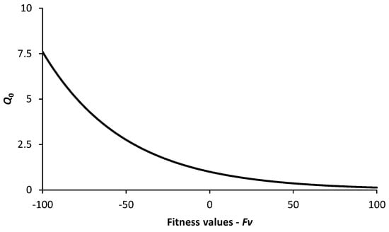 To avoid introducing any abrupt modifications during the conversion of the fitness value into attractiveness, and thus to the resulting impact on the particle interactions, it may be suggested that an appropriate formulation should describe a low-order function, ensuring, a least, a continuous second derivative. The combination of the above two formulas for as proposed in [] does not respect this condition. Thus, the present study instead suggests determining Q0 using Equation (9), where k0 and k1 are two constants, respectively set at 1.5 and 20.