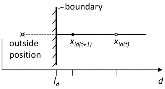 First, the proposed scheme limits the velocity amplitude, as indicated in Equation (10) (Figure 1, Part B-10). In Equation (10) Ld denotes the domain length along dimension d. More importantly, however, to grant the model the ability to concurrently detect multiple optima located close to and exactly on the boundary, as well as distributed across the search space, efficiently, the adopted correction relocates the particles reaching outside a dimension d of the search domain at a random position between their starting position and the boundary. Figure 4 illustrates this description, while Equation (11) formulates it, where is a random number between 0 and 1 and ld is the coordinate of the boundary along the d-axis:
