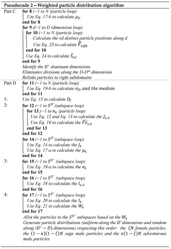 To solve the problem, the authors of [] first reduced the domain dimensionality via a Principal Component Analysis (PCA). Since the domain segmentation introduced herein and defined by the SD subdomains would rapidly require unmanageable numbers of particles, the second step (Part C in Figure 5) aims to reduce the problem dimensionality. It should reduce the number of dimensions considered during the segmentation from D to D*. Therefore, instead of SD, the operation will involve SD* subdomains. Based on the Ref. [] suggestion, the maximal value for D* here is three. Thus, if , then otherwise .