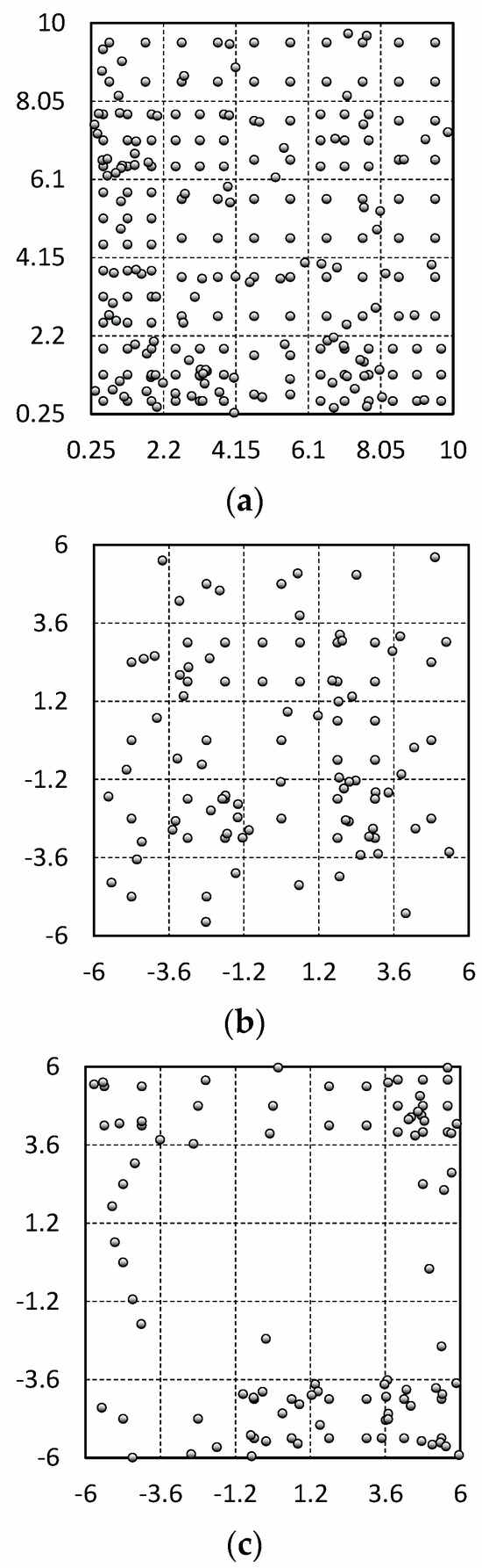 The algorithm described above is first designed to operate over multimodal landscapes having multiple optima. Larger values such as 1000 or 10,000 (Figure 2a) restrain the sage males’ mobility and force a clustering response. However, the same algorithm should also perform very well over single optimum domains. Indeed, low values of such as 0.5 practically eliminate the mobility restrictions imposed on the sage males (Figure 2a), and consequently, on the females. They move freely and are thus able to gather around a single position. On the other hand, the adventurous males still maintain high exploration levels. Obviously, renders the algorithm completely versatile.