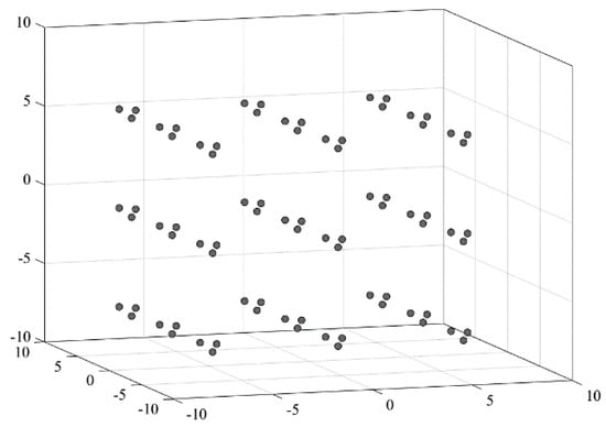 These two specific landscapes concentrate many optima in small areas of their domains. To illustrate this description, Figure 14 shows the optimal positions of F8, the 3D version of the Shubert function. First, to locate optima, S-EPSO necessitates a sufficient number of particles able to move and reach their positions. Later on, the medium haziness controls the ability of the algorithm to preserve the found locations. However, while this results in high precision optima positions, this haziness also simultaneously limits the mobility of numerous particles. This mobility reduction lessens their ability to move toward new optima. On the other hand, larger numbers of particles may successfully compensate for this reduced mobility. Hence, to detect numerous optima concentrated in small zones, such as those of the Shubert and Vincent functions, the procedure must combine a sufficiently large particle number to probe the search space and a high value to form clusters and improve the precision of the identified position locations. However, large particle numbers can rapidly lead to excessive numbers of function evaluations. In clear, in a context of a limited number of function evaluations, too large particle numbers limit the number of successive improvement steps and ultimately reduce the algorithm precision. The best particle number-haziness combination is thus a trade-off.