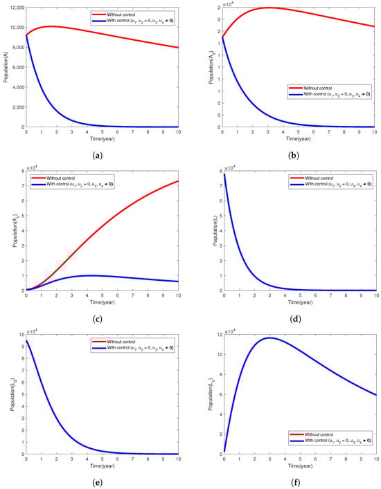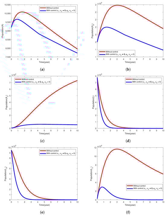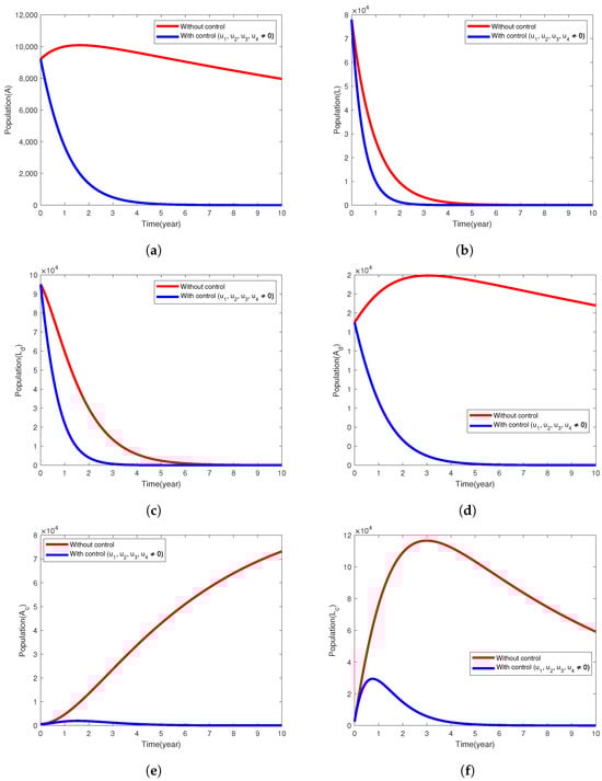 Under this intervention strategy, the focus is mainly on preventing the populace from developing diabetes and tuberculosis infections in either the latent or active form. This preventive effort involves a treatment effort that provides a saturated treatment of TB infections in the latent form and mass sensitization of the community on how to prevent developing tuberculosis and diabetes. We use the control parameters and to minimize J, the objective functional (2), while . In Figure 1, we observe that TB disease persists in the infected classes () with or without the control strategy being executed (Figure 1a–c). At the end of the 10-year implementation period of this control strategy, only 1476 and 1082 TB infections were averted in the A and classes, respectively. We observe in Figure 1d,e that the number of people exposed to Mycobaterium TB in latent form in each L and compartments approach zero at the final time . The number of individuals latently infected with TB and diabetic (with its complications) decreased significantly with this control strategy and persists without control (Figure 1f).
