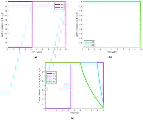 In Figure 4, the optimal control profile graphs of different intervention strategies implemented are shown. It is observed that in the intervention strategy with the prevention of active TB and diabetes (Figure 4a), the control parameter should be sustained at the maximum bound throughout the control period and may be kept at the minimum level for the first 4 years and ought to be carried on at the highest bound throughout the rest of the implementation of this control strategy. For the intervention strategy with treatment effort towards active tuberculosis disease (Figure 4b), the control variables and should be maintained at the peak level for the implementation of this intervention strategy. Lastly, for the control strategy that combines all the control parameters, it is significant to mention that the control variable is to be upheld at the maximum bound throughout. and should sustain maximum efforts for 9 and 6 years, respectively. The control variable may be used at the lowest bound for the first 4.5 years and then should be maintained at its peak bound for the remaining years during the implementation period (see Figure 4c).