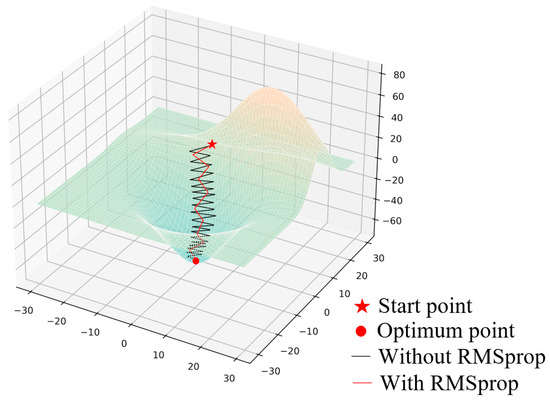 In the SGD-based LFT model, if the objective function’s surface exhibits complex topography (such as elongated valleys), the gradient direction may deviate from the optimal path, leading to slow convergence or even oscillations. The RMSprop algorithm addresses this by employing exponentially weighted moving averages of squared gradients to dynamically adapt the learning rate. This approach mitigates gradient fluctuations and accommodates sparse gradients, thereby optimizing the path toward more stable and efficient convergence. As illustrated in Figure 1, RMSprop demonstrates a more direct trajectory toward the optimal solution, achieving faster convergence with reduced oscillations. Therefore, adopting the RMSprop algorithm is essential for enhancing model training efficiency in complex optimization problems.