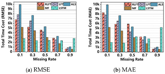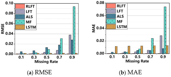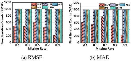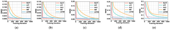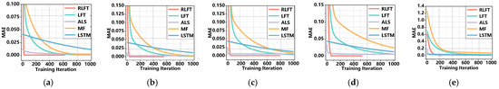 - The RLFT model demonstrates unique advantages in computational efficiency. As shown in Figure 6 and Table 6, RLFT exhibits significantly lower time costs compared to (1) the ALS model across all missing rates; (2) the LFT model at missing rates of 0.1, 0.3, and 0.9; and (3) the LSTM model at a missing rate of 0.9. However, RLFT requires more computation time than (1) the MF model, (2) the LFT model at missing rates of 0.5 and 0.7, and (3) the LSTM model at missing rates of 0.1, 0.3, 0.5, and 0.7. Notably, RLFT converges in only 507, 493, 616, 473, and 226 iterations across different missing rates, while all other models reach the preset maximum of 1000 iterations. This demonstrates RLFT’s superior training efficiency through faster convergence. Furthermore, RLFT outperforms all comparative models in both RMSE and MAE metrics. Therefore, when comprehensively considering both convergence speed and prediction accuracy, the RLFT model demonstrates unique advantages in computational efficiency, delivering more reliable prediction results within significantly reduced timeframes. This distinctive characteristic enables substantial savings in actual training time when processing large-scale or complex datasets.