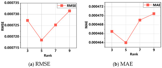 The predictive accuracy of the RLFT model exhibits a distinct trend as the rank R varies. As depicted in Figure 7, when the rank increases from 3 to 5, both the RMSE and MAE of the model decrease. Specifically, at rank 3, the RMSE is 7.273 × 10−4 and the MAE is 4.665 × 10−4. In contrast, at rank 5, the RMSE reduces to 7.185 × 10−4 and the MAE to 4.640 × 10−4, corresponding to predictive accuracy improvements of 1.21% and 0.54%, respectively. However, as the rank increases from 7 to 9, both RMSE and MAE exhibit an upward trend. This suggests that the model achieves optimal fitting at rank 5. Ranks that are either too high or too low may lead to suboptimal model performance. Consequently, selecting an appropriate rank value is crucial for optimizing the performance of the RLFT model in practical applications.